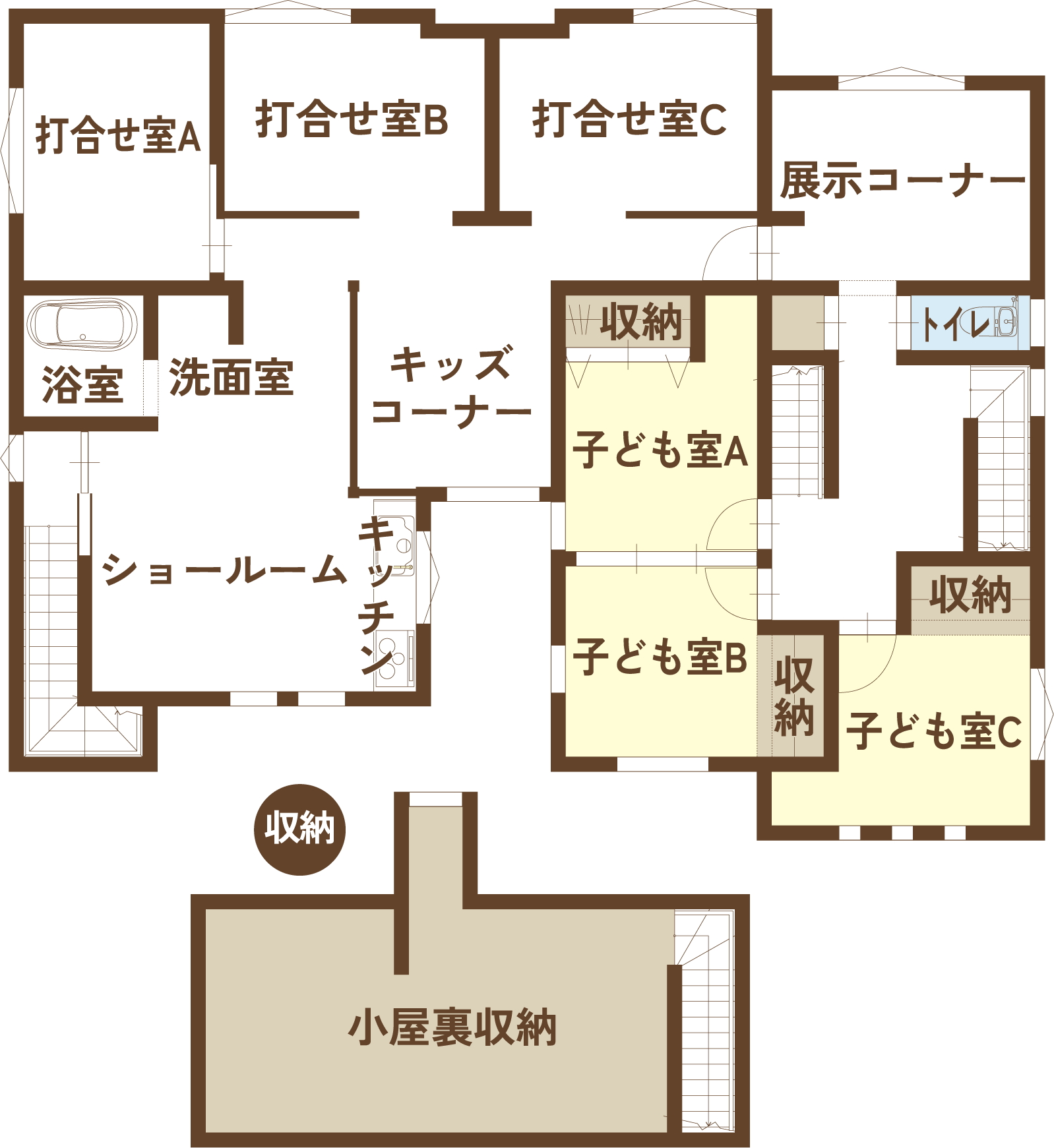 1F:72.30㎡(21.87坪) / 2F:43.88㎡(13.27坪) / 小屋裏収納面積:24.42㎡( 7.38坪) 延床面積:116.18㎡(35.14坪)