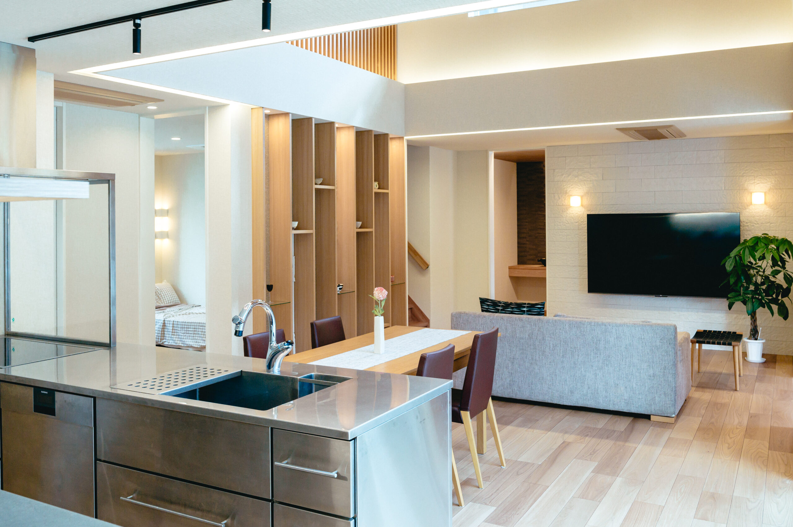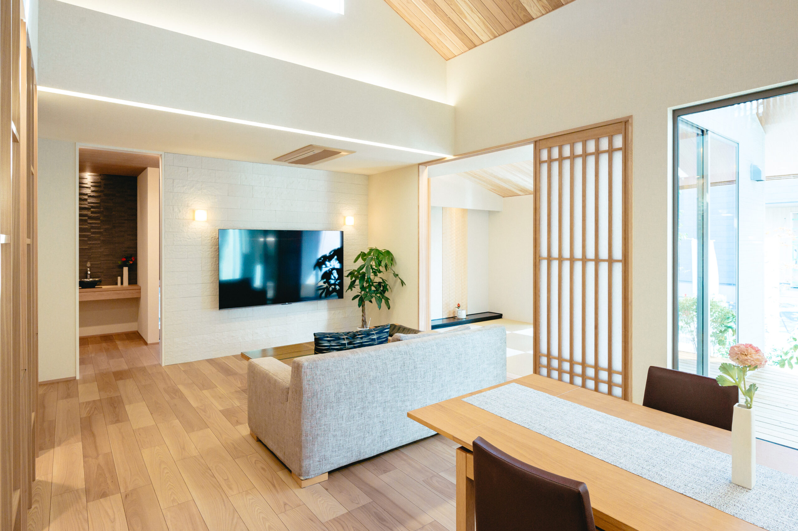 - 20帖を超えるLDKと一体化した6.2帖の和室、2階ファミリールームへつながる開放的な吹抜けは贅沢な時間を過ごす空間に。