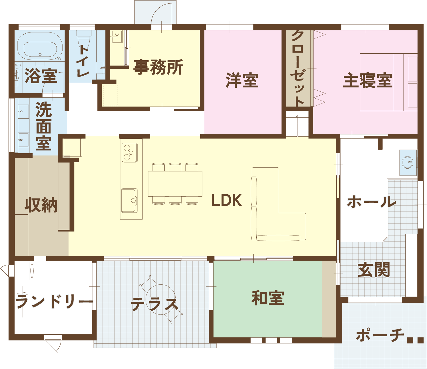 - 浴室・洗面脱衣室・ファミリークローク・室内物干可能なランドリールーム・さらに屋外物干テラスをつなぐ楽々動線。