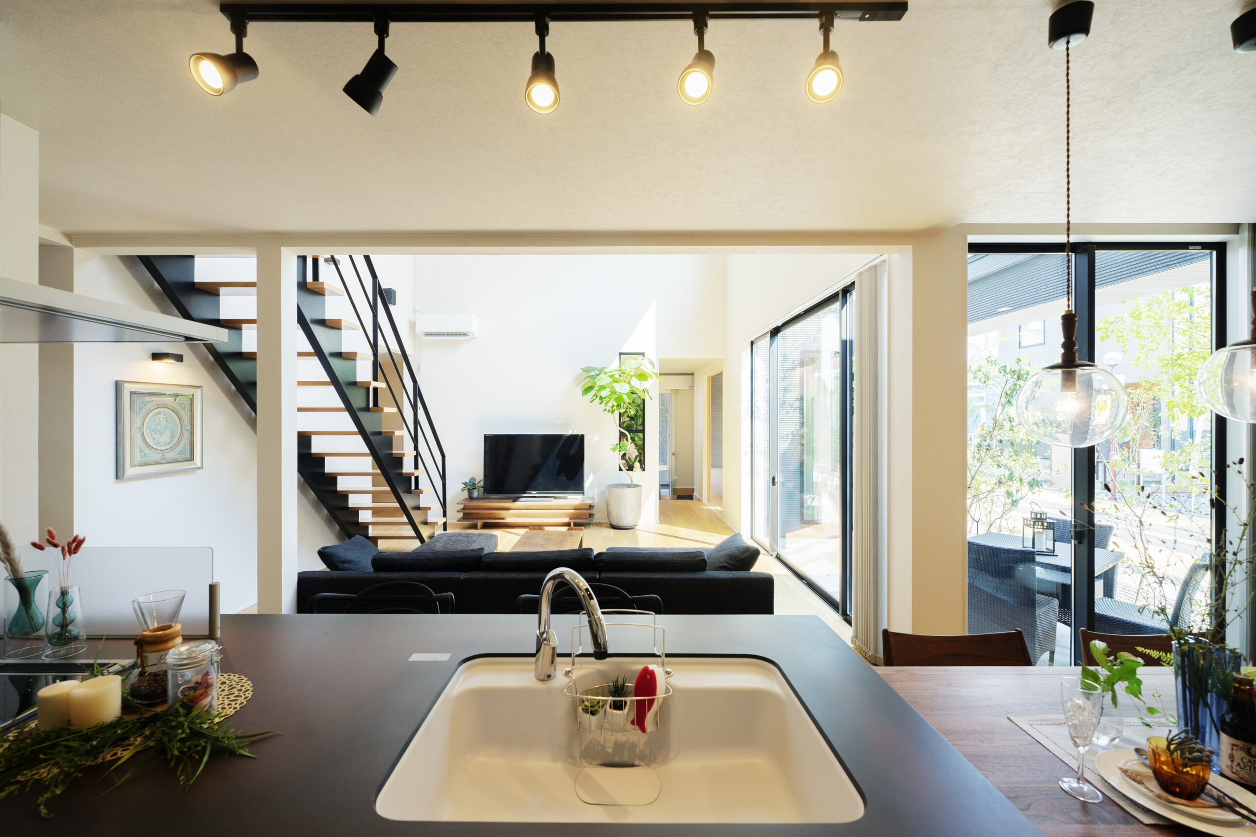 - 吹き抜けが開放的、家族がのびのび過ごせる広々LDK